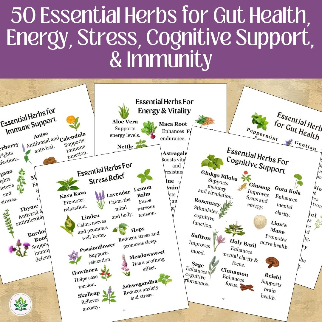 🌱 50 Essential Herb Profiles — clear benefits, best uses, and how to prepare Lavender, Peppermint, Ginger, Ashwagandha, Chamomile, Ginkgo Biloba, and more.