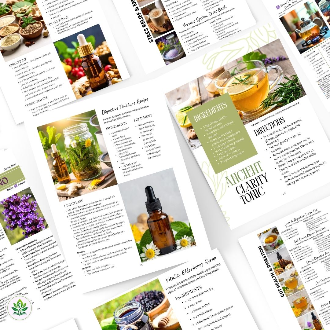 🧪 200+ Step-by-Step Remedies — teas/infusions, decoctions, tinctures, syrups, salves/balms, poultices, and simple aromatics with ratios, steep times, and storage tips.